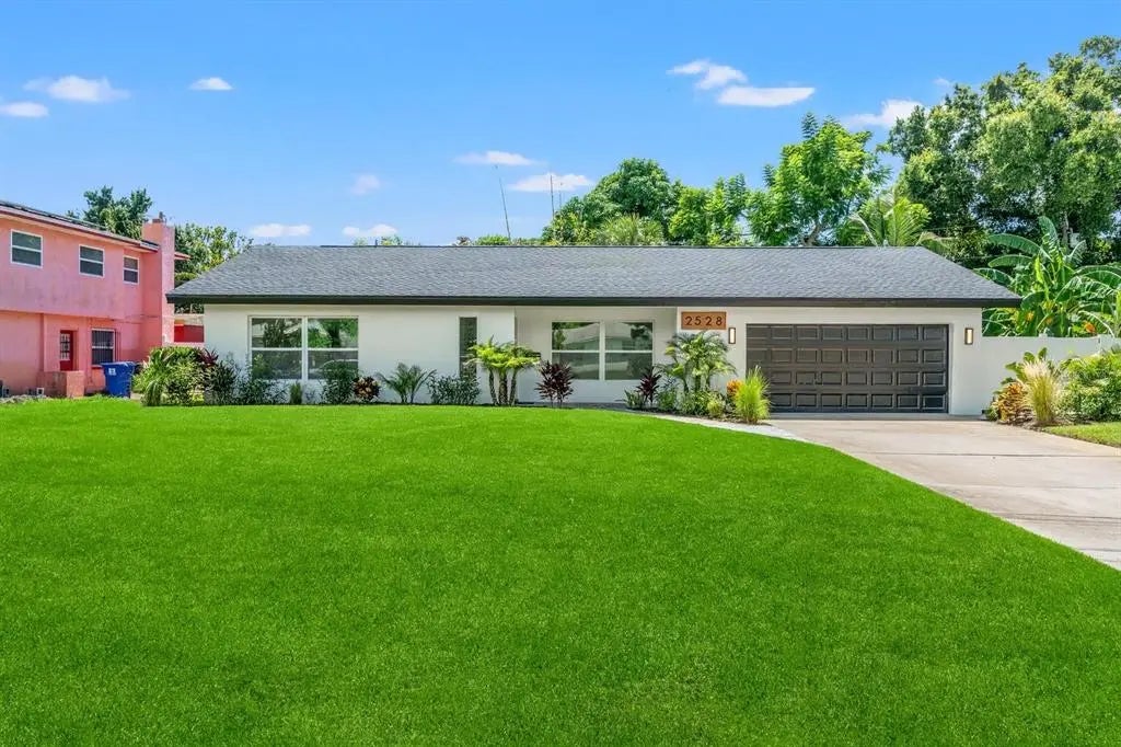 Welcome to your dream home in the highly desirable Lakewood Estates neighborhood of St. Petersburg. This fully renovated residence blends timeless design with modern comfort, offering peace of mind with a brand-new roof, impact windows, and a non-flood zone location. Inside, the home showcases an open, inviting floor plan with new tile flooring throughout, solid core doors, moldings, recessed lighting, and thoughtful custom finishes. The spacious living room features a new electric fireplace with custom shelving, while the dining area is enhanced by a striking feature wall that adds character and warmth. The gourmet kitchen has been completely reimagined with soft-close cabinetry, quartz countertops, modern stainless steel appliances, a large pantry, and abundant counter space—perfect for both everyday living and entertaining. The primary suite was expanded to include a spa-inspired bathroom with an oversized dual-sink vanity, dual shower heads, new tile, and glass shower doors. Both additional bathrooms have also been gutted and rebuilt with stylish new finishes, creating a fresh, modern feel throughout. One of these bathrooms is contained within the front bedroom, giving the home an additional en-suite. Every detail of this home has been addressed, including a new HVAC system, new plumbing and water heater, and a 200-amp copper wiring electric service. The lanai has been renovated with new flooring and screening, complemented by fresh landscaping and new pavers at the front and side entrances. Outside, a fully fenced yard with vinyl privacy fencing and a sprinkler system provides convenience and peace of mind. The attached two-car garage offers even more, featuring an automatic door opener and an EV charger for your electric vehicle. This move-in-ready home truly checks every box—modern upgrades, thoughtful design, and a sought-after location. Positioned steps away from the recently renovated St Petersburg Country Club, and minutes from beaches and downtown St. Petersburg this home is the one you've been waiting for.